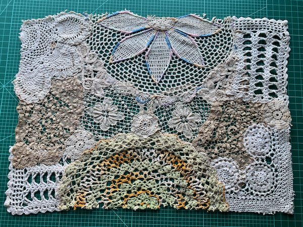 I always like to learn something new, and a way to use up my fabric. I took an online class with Judy Gelzinis Donovan called Creating New Cloth from Old Lace. It was fun, and I need to get out that box of lace and doilies and do more of it.
